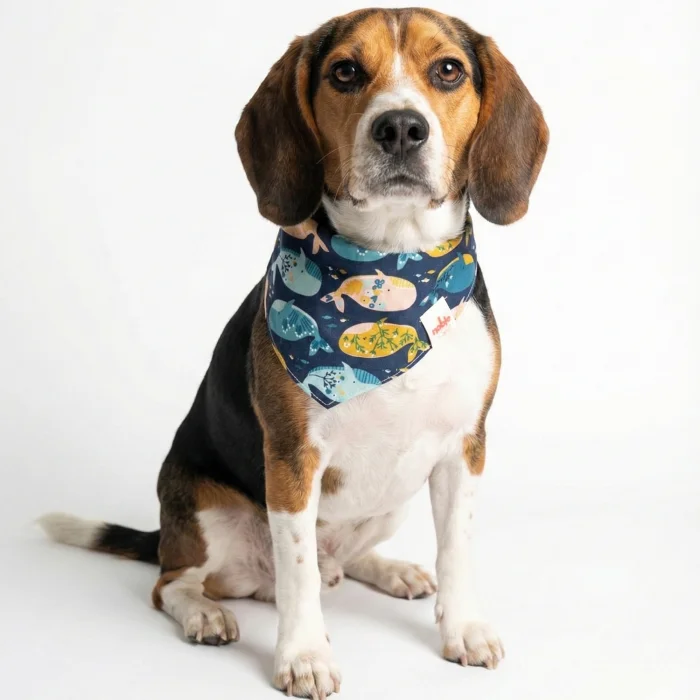 Navy blue whale pattern dog scarf is 100% cotton fabric. You can choose the size according to whether your dog is small, medium or large breed.