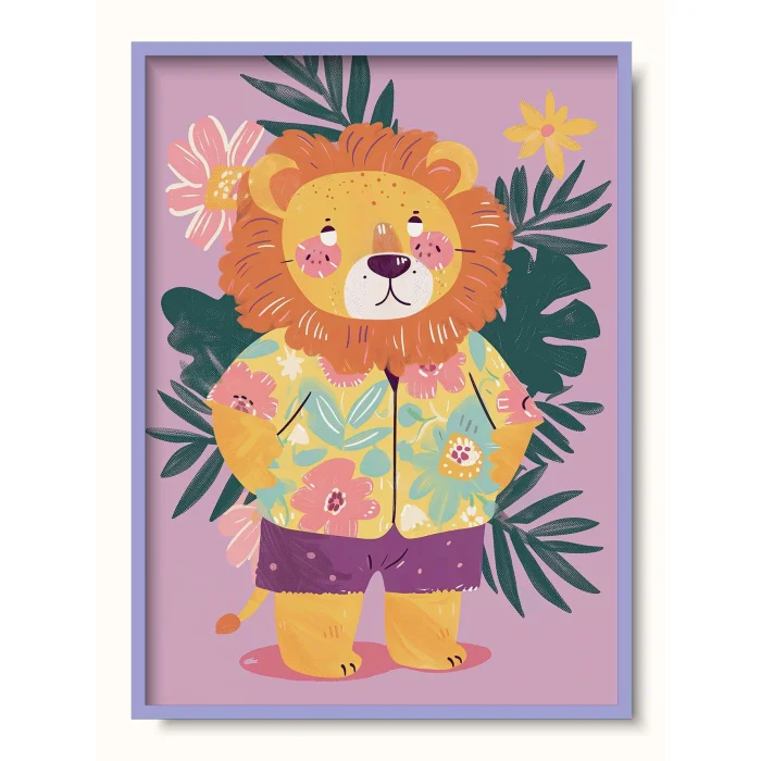 A lion in floral clothes on a background of tropical flowers.