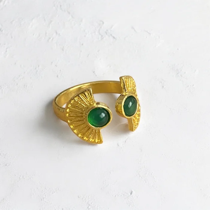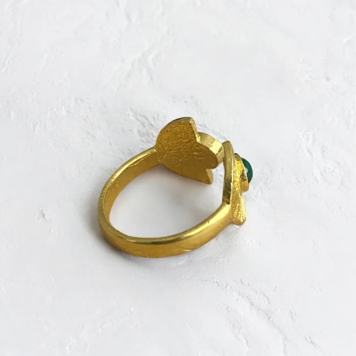 It is made of natural stone and brass. Since it is adjustable, it is compatible with all fingers. Due to the 100% natural materials, there may be slight variations in color and pattern.