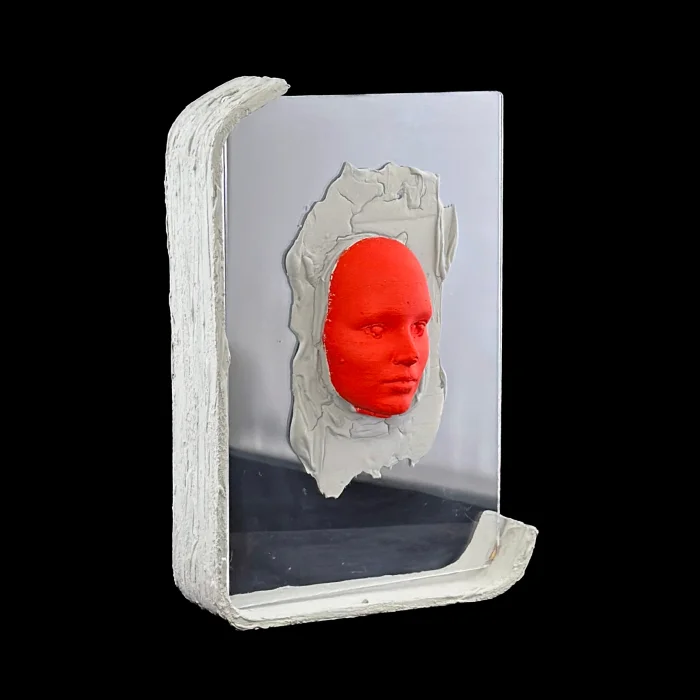 It is an original work that is completely handmade. The frame is made with concrete relief paste. The glass part is transparent acrylic. The mask is cast concrete.