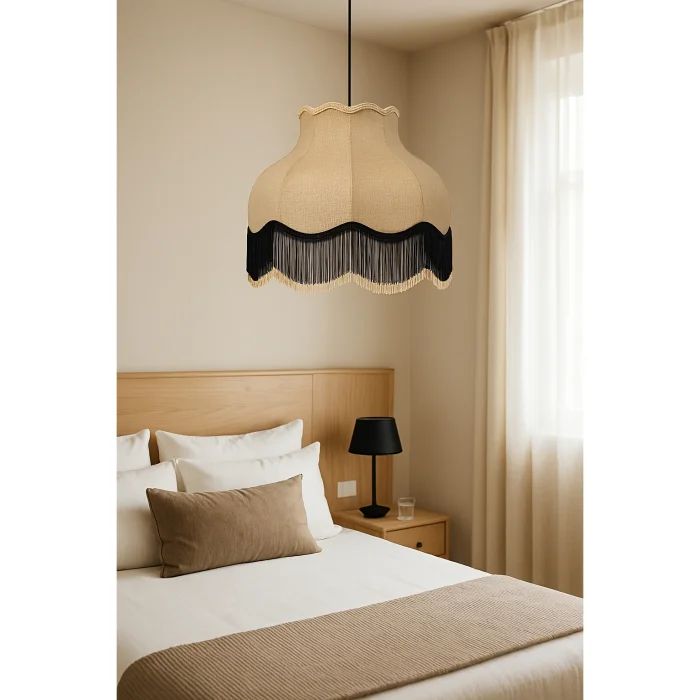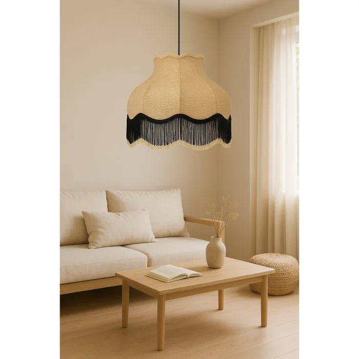 The Victoria Pendant Chandelier offers a nostalgic yet modern style by combining the natural beige tone of linen fabric with a black-cream tassel detail. There is a sense of elegance that comes from simplicity in every detail.
