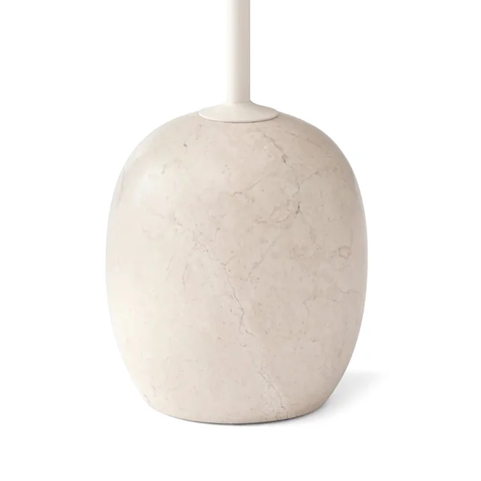 There is a white oven-painted metal table on a natural travertine marble base. Table diameter 40 cm, product height 50 cm.