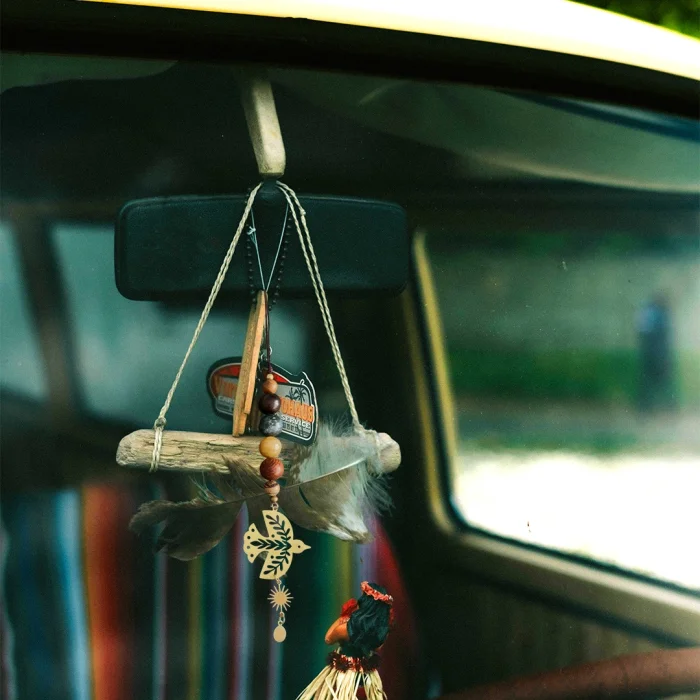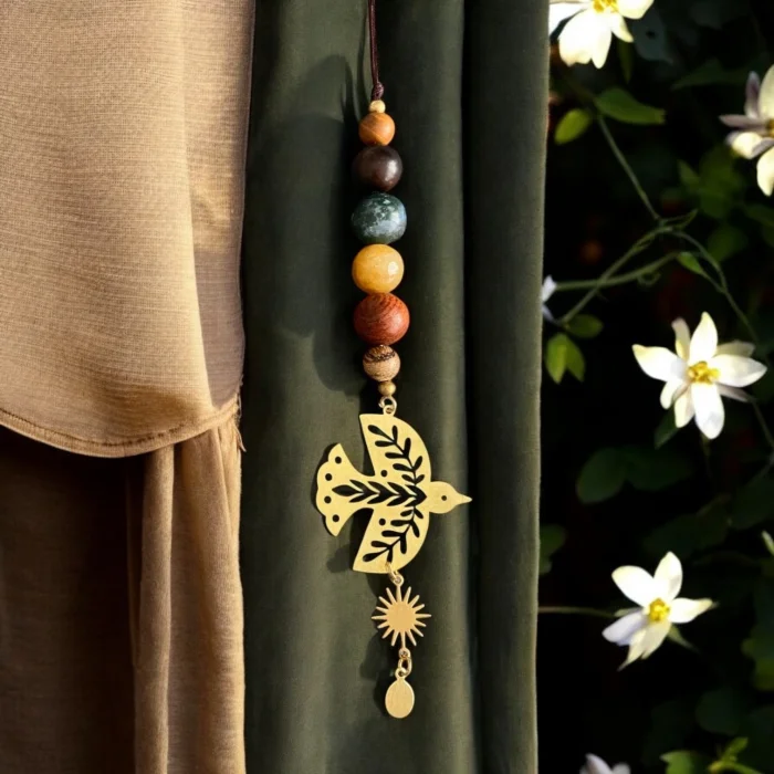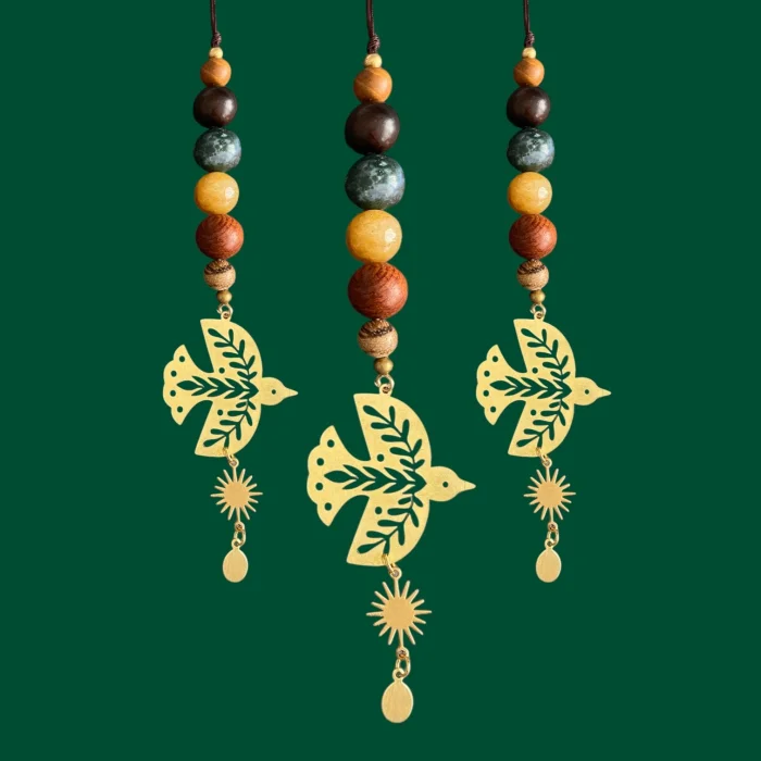 A mini-sized wall, bag, and vanity mirror accessory made from various natural stones and sandalwood beads. Due to the 100% natural materials, there may be slight color and pattern variations.