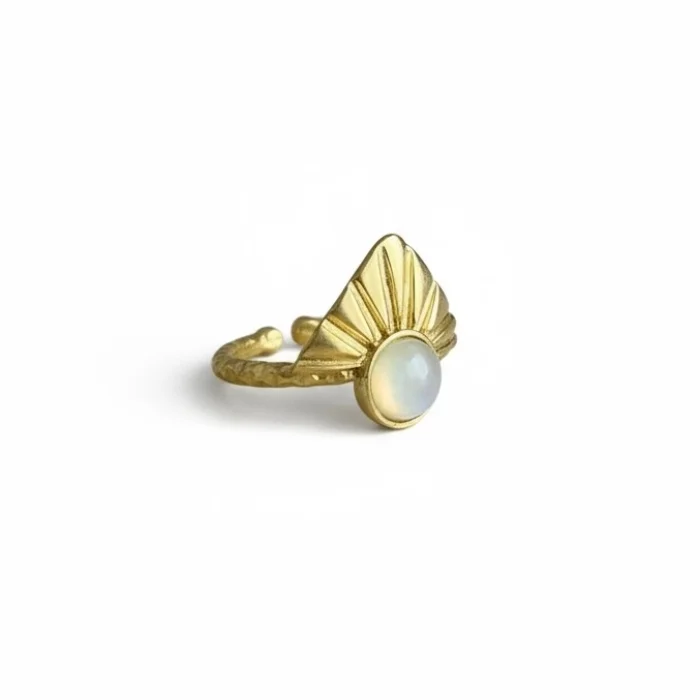 It is made of natural stone and brass. Since it is adjustable, it is compatible with all fingers. Due to the 100% natural materials, there may be slight variations in color and pattern.