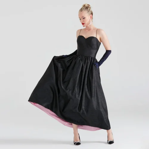 Sweetheart neckline, thin straps (optional conversion to strapless if folded inward), with a gathered waist, pocket details, and maxi length. Blush pink satin lining.
