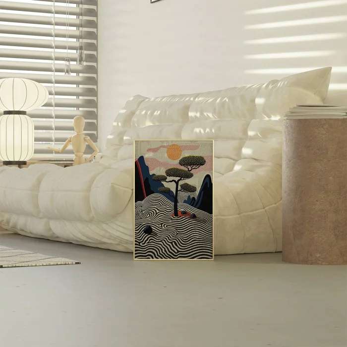 Patterned trees and rolling waves, a mosaic sun backdrop, a mountain landscape stylized in pastel shades.