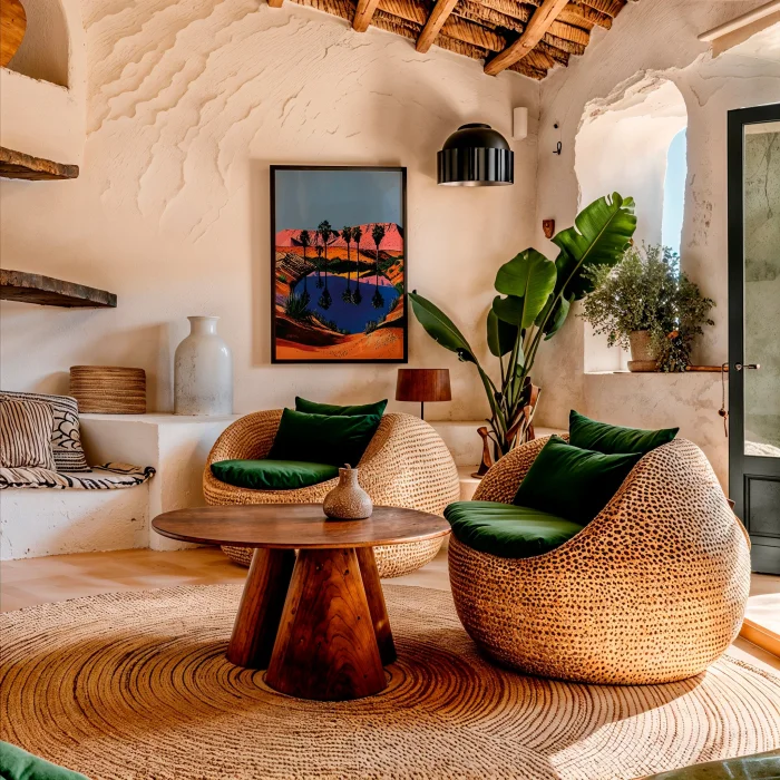 A desert oasis where towering palms are reflected in a serene, blue pond.