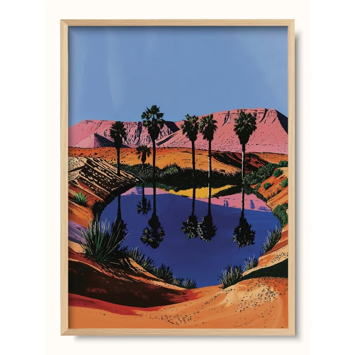 A desert oasis where towering palms are reflected in a serene, blue pond.