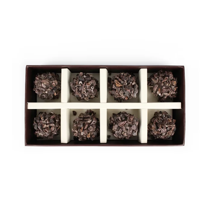 dark ganache filled with no added sugar, which will be addictive for chocolate lovers with a dense inside, and the outside is covered with cocoa nibs (broken cocoa beans). A 100% vegan product experience is waiting for you.