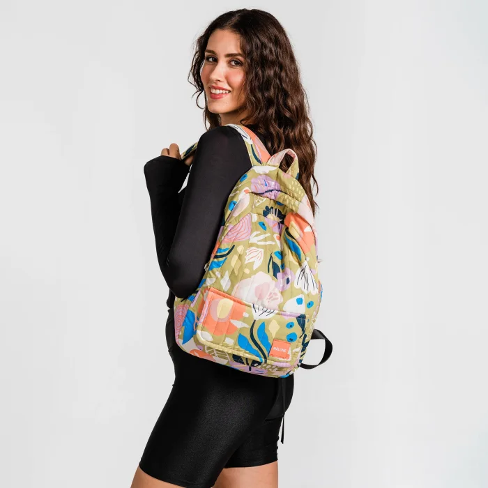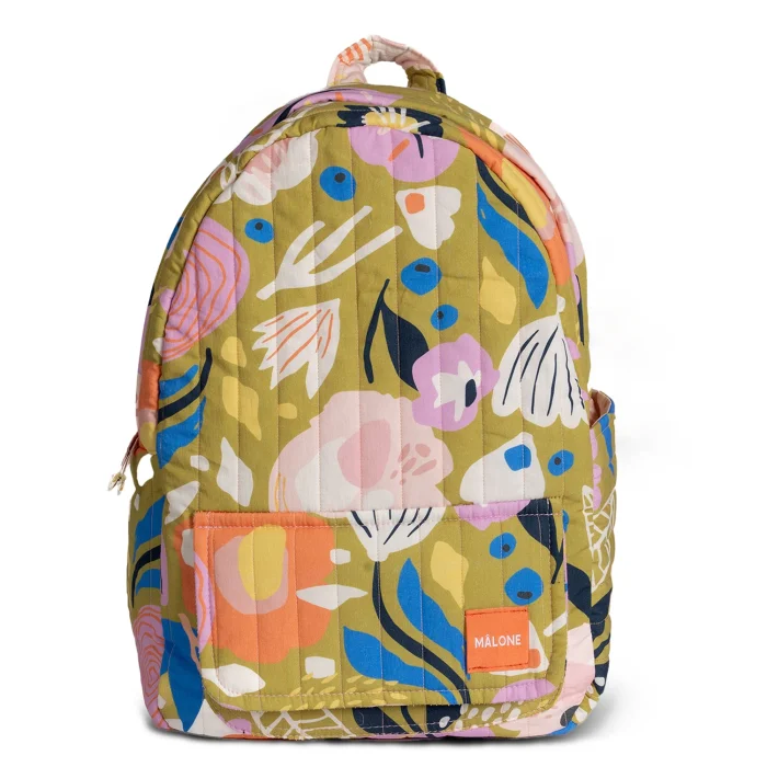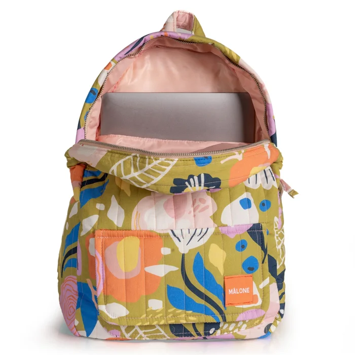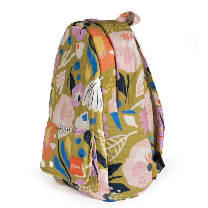 Take on a new style with Mâlone natural cotton fabric quilted backpacks. Complete your daily or business style with a calm transition during the day without changing your bag. Product Details Handle handle. Shoulder straps with adjustable metal buckles. Concealed top zipper closure so as not to disturb the integrity of the fabric texture and pattern. Front pocket, a thermos pocket on the side. Inner laptop compartment. Colorful patterns and matching combined inner lining fabric. All welt seams and inner filling. 40 cm H x 28 cm W x 11 cm D. Outer layer: 100% natural cotton. Inner layer: micro fabric.