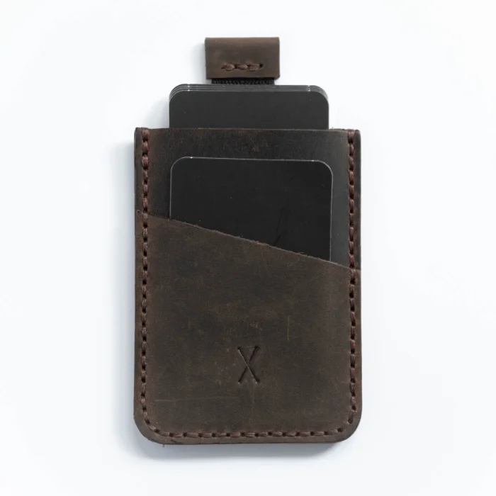 minimal X V2 Mechanism Card Holder Material: Genuine Calf Leather Closed Dimensions: 10 x 7 cm Leather Thickness: 1.3 - 1.4 mm Product Weight: 30 Grams The maximum card capacity is 5-6 pcs. Or a couple of banknotes along with 4-5 cards. Minimalist and Stylish Design. It is real leather and handmade. Our products are sent as a standard gift package. NOTE: Since it is real leather, there may be slight color tone differences. NOTE2: Products and pens other than the Leather Pen Holder are not included in the use of visual decoration purposes.