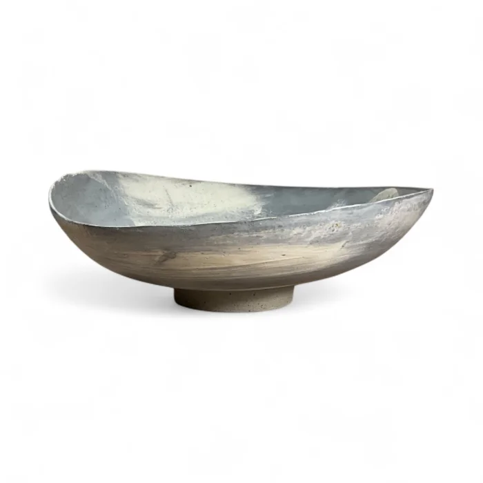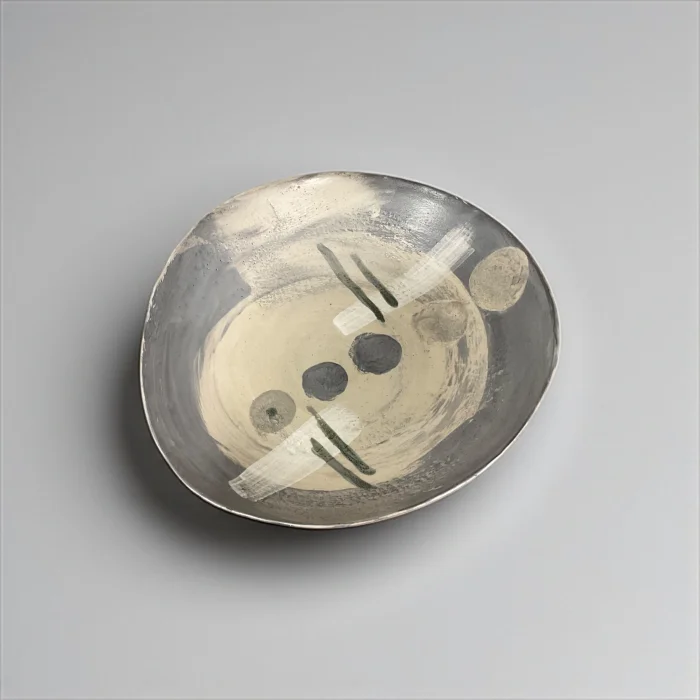 This ceramic bowl, crafted entirely by hand, has the balanced harmony of gray and cream tones. The brush strokes and geometric patterns on it make each piece unique. Thanks to its wide form, it stands out both in services and for decorative purposes.