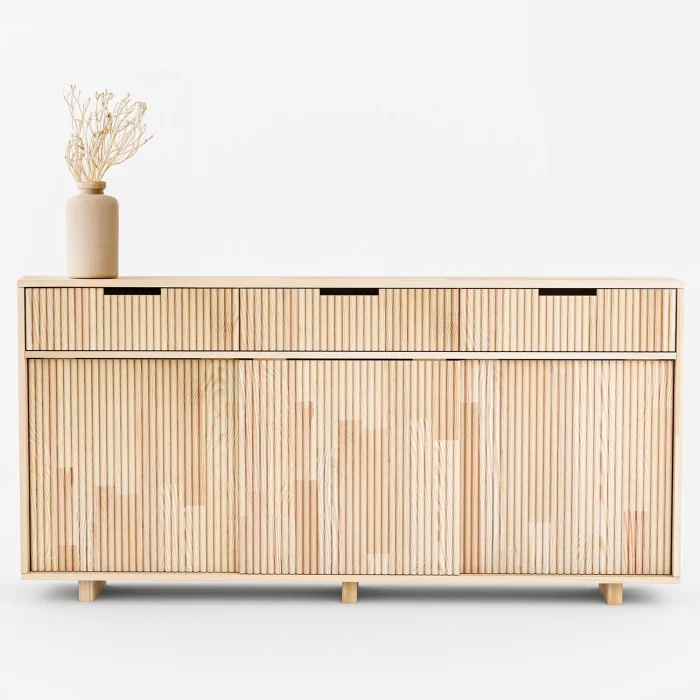 Expertly crafted from FSC-certified® pine wood, this versatile piece combines style and functionality. With handmade drawers and ample storage space behind sliding doors, it's perfect for organizing everything from tableware to electronics, books, or decorative objects. With its minimalist Scandinavian design and textured surface, this sideboard can also be used as a media console, side cabinet or a modern console, blending seamlessly into any space, such as dining rooms, living areas or entrances. Durable, eco-friendly and timeless, this piece enhances any interior.