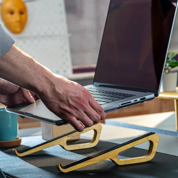 • Product Dimensions: 24.5x6cm • Length: 24.5cm • Height: 6cm • It can be used up to 12-17 inch laptop size. Felt was applied on the wood to prevent damage to the laptop and a softer texture emerged. It is sent with a specially produced pouch for easy carrying. All of our products are produced in our wood workshops in Izmir. Since it is produced entirely from natural wood, there may be color and pattern differences between the products. The product is made of pine wood, water-based varnish is used, which is harmless to health. You can use it for a long time with peace of mind. The varnish made to protect the products is handcrafted by our certified teachers in the art workshop.