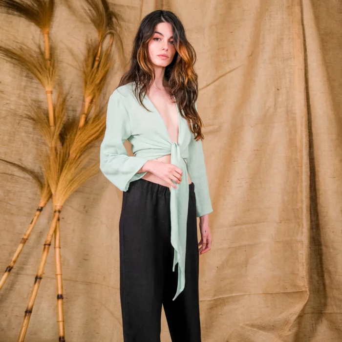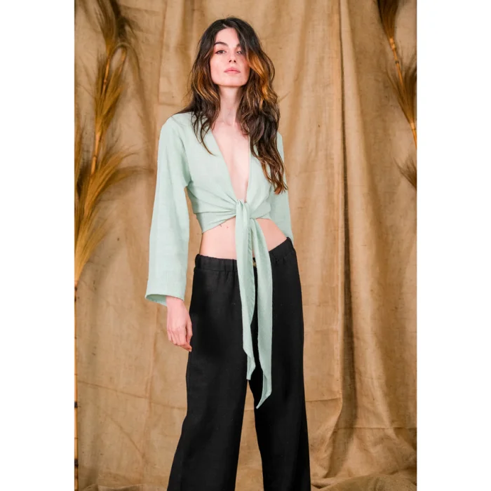 Esmeralda, the tie-front crop top with flute sleeves. The hand-loomed  linen & cotton top, that embodies a natural and primitive look, invites your Goddess within. The beautiful lengthy ties gives you the option to tie the top from the  front or the back depending on how you want to style your look. The model is also wearing the Aster Pant or Inej Skirt.