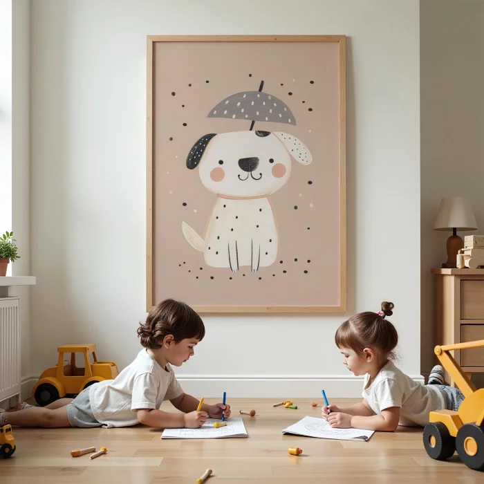 Product: Puppy Standing Under Umbrella Kids Room Wooden Wall Art