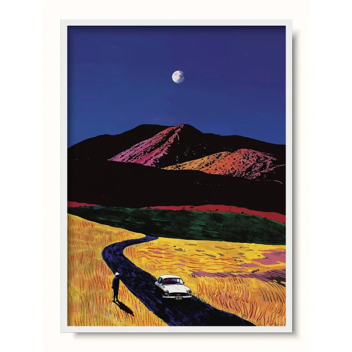 A car parked on the road that winds through the golden fields.