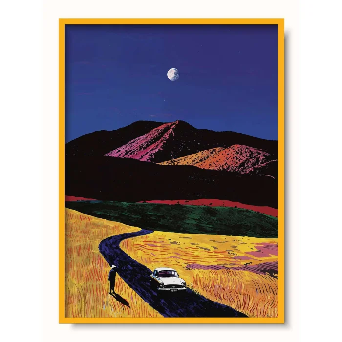 A car parked on the road that winds through the golden fields.