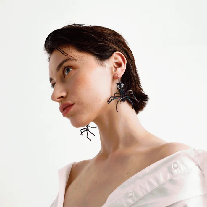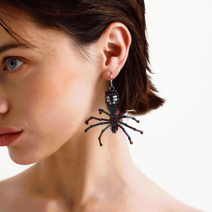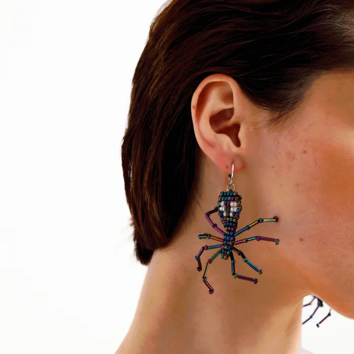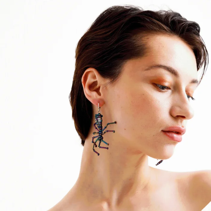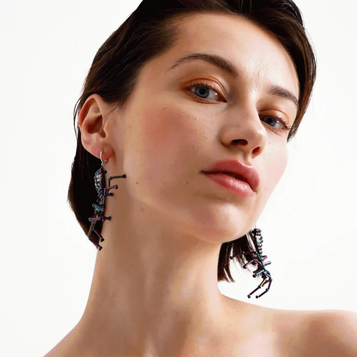 Graffiti steel hoop earrings with a reptiloid figure knitted with sand beads.