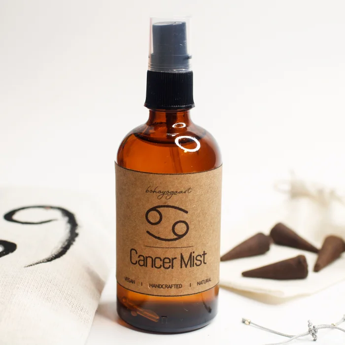 In this set, which we have prepared for use in your meditations and rituals, there are special products with the symbol of the crab sign, natural stones and aromas. The scents of Cancer are sandalwood and chamomile scents. We have used these flavors in our candles, mist and oils. Cancer body mist is prepared with pure water, sandalwood and chamomile essential oils in a 100 ml glass bottle. It does not contain any chemicals. You can easily spray it on yourself, your hair, your pillow or the area where you will meditate.