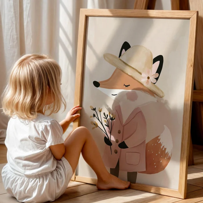 Product: Boho Şapkalı Pink Elbiseli Fox Girls' Room Wooden Wall Art