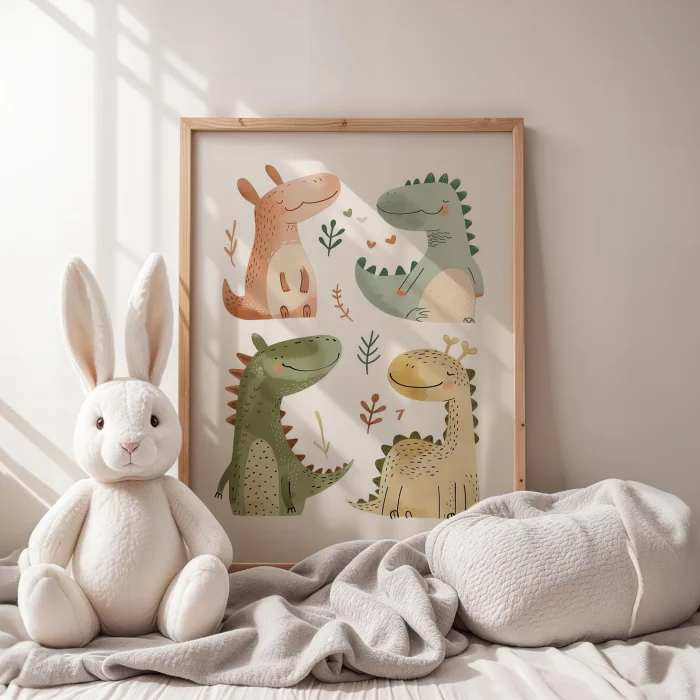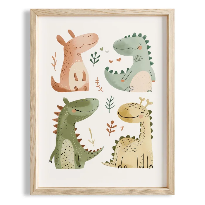 Kardeş Yavru Dinazorlar - Children's Room Wooden Framed Wall Art