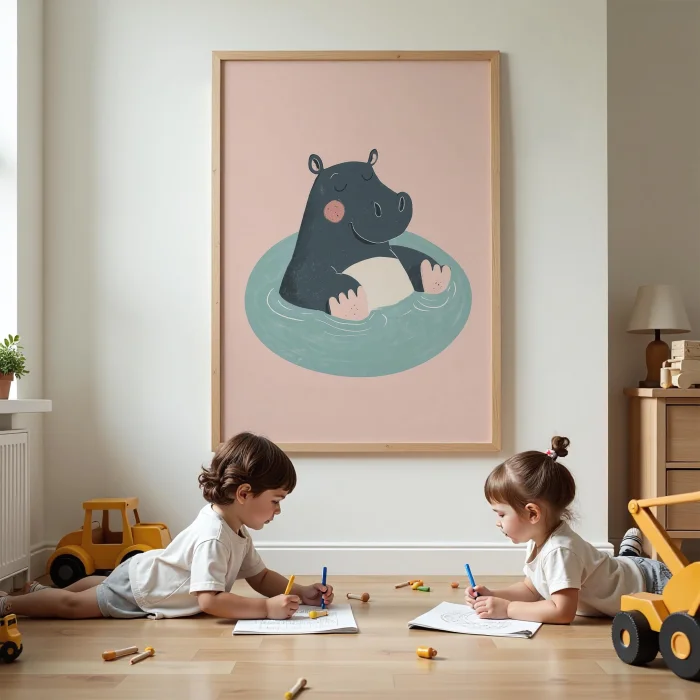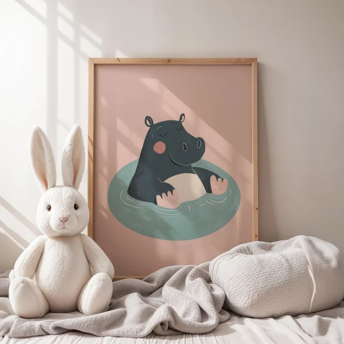 Product: Swimmer Gergedan - Pink Background Children's Room Wooden Framed Wall Art