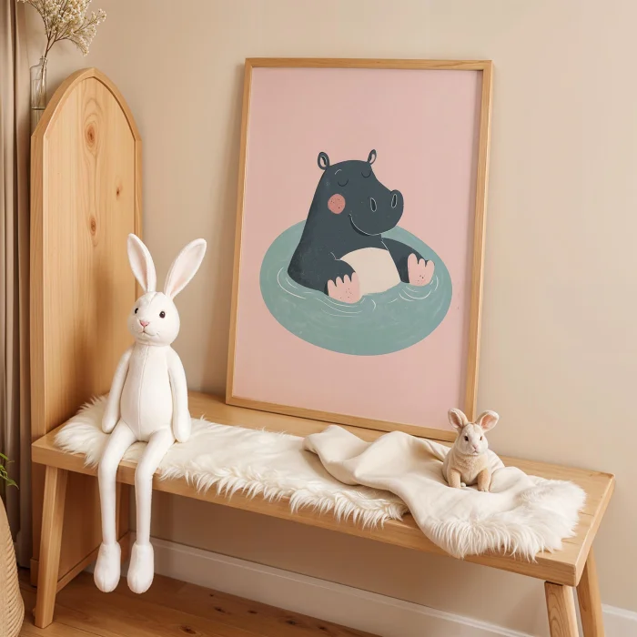 Product: Swimmer Gergedan - Pink Background Children's Room Wooden Framed Wall Art