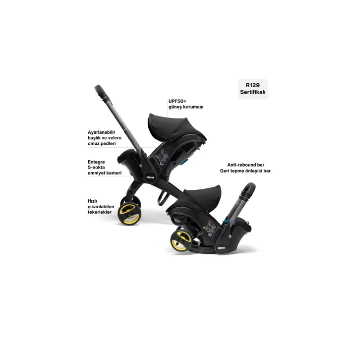 Doona i Baby Stroller Turns Into Wheeled Gr 0 i-Size Baby Lap Car Seat (40-85 cm / From birth to 13kg)From Car Seat to Stroller with One Click in Seconds! The Doona i Wheeled Baby Lap Car Seat is a revolutionary travel system that has evolved from a baby car seat to a stylish stroller in a transformation that makes your life easier in seconds. Designed with the needs of our modern parents in mind, Doonai offers safety and comfort at every stage. As one of the safest car seats available today, Doona is the only car seat that has been tested and certified as an infant car seat, stroller and baby carrier. It ensures the comprehensive safety of your baby in all circumstances. Doona-i is a fully integrated travel system that allows you to switch from a car seat to a stroller in seconds. With its integrated, adjustable seat belt and head restraint, the Doona-i complies with the European i-Size safety directive (R-129). Thanks to its sleek design, you can move effortlessly with your baby, whether in your car, on public transport or while moving around the city. This revolutionary car seat and stroller offers a safe and practical solution for our parents on the go. With its uniquely developed side-impact protection, dual-wall construction, Doona SIP attachment, collision technology with anti-rebound bar, superior 5-point safety belt and ergonomic neonatal pad, the Doona i Wheelchair Car Seat is one of the safest car seats available today. It has been designed in conjunction with medical and engineering experts to ensure that the baby body is properly supported in the correct ergonomic position. The ergonomic design of the Doona i newborn pad supports your newborn's upper and lower back and ensures that your baby's neck and back are ergonomically aligned. Product Features & BenefitsOne-touch conversion – From car seat to stroller in secondsAdjustable head restraintIntegrated seat beltAdvanced side-impact protectionAdjustable handle – Also functions as an anti-rebound bar in the carQuick-release wheelsLeather handle cover5-point seat beltRemovable and washable textilesNewborn padwith bamboo fiberHighest safety and quality standardsBaby-safe materialsDriving only Used in the opposite direction of Isofix base Compatible with Isofix plinth approved by TUV and FAA for travelPackage Includes:Doona i Wheeled Baby Lap Car SeatCar Seat Protection FabricNewborn PadCommitment to SafetyIt is the only product that meets the quality and safety requirements of all standards such as ECE R-129, EN1888, EN12790 at the same time.