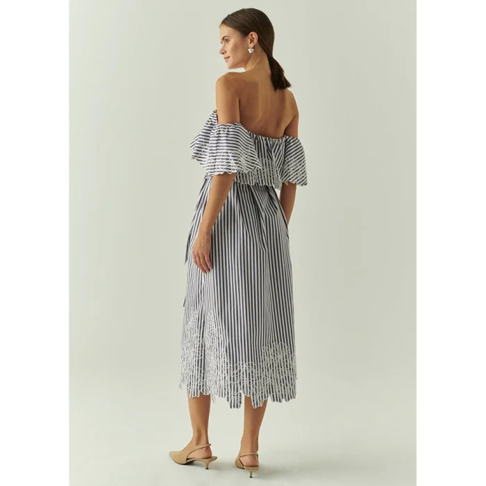 Product: Embroidered Detailed Striped Off-the-shoulder Ruffle Midi Dress