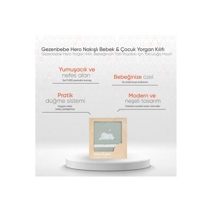 Product Description: Gezenbebe Hero Embroidered Baby & Child Quilt Cover (100x135): With Your Baby Every Night With Heroes Who Add Color To Dreams! Gezenbebe Hero Embroidered Baby & Child Quilt Cover has been carefully designed to make the little ones' sleep more colorful and comfortable. The combination of the calmness of pastel colors and the iconic Gezenbebe pattern will add not only elegance but also a loving atmosphere to your baby's and child's bed. The embroidery details of Gezenbebe's most beloved heroes, Elephant, Koala, Teddy Bear and Rabbit, make the quilt cover special and unique. Highlights:GEZENBEBE'S FAIRYTALE WORLD: Enrich your baby's dreams with Gezenbebe's iconic pattern and cute heroes. SKIN-FRIENDLY FABRIC: With its 100% cotton and breathable fabric, it offers the perfect touch for the sensitive skin of the little ones. CONVENIENT DESIGN: The practical button system offers the advantage of easily placing the duvet in the cover and staying stable. MODERN AND CHEERFUL: Let's add a warm and cheerful atmosphere to your baby's room with trendy patterns. FOR EVERY BABY: With its unisex style and color palette, it's an ideal choice for every baby. HARMLESS TO HEALTH: Water-based paint is preferred in prints, considering the health of your baby. PURSUIT OF EXCELLENCE: We continuously improve our quality, harmony and convenience through customer feedback. Technical Details: Our Gezenbebe quilt cover; It has dimensions of 100x135 cm and is fully compatible with baby and children's beds. It is designed to fit perfectly into standard baby and children's quilts. Color Options: Bunny (Rabbit), Elephant (Elephant), Koala (Koala) and Teddy (Teddy) Care Instructions: Wash at 30 degrees and dry without exposing to direct sunlight. With the Gezenbebe quilt cover, your little ones' sleep will be both comfortable and stylish. This special design, thought out in every detail, will accompany your baby's sweet dreams.