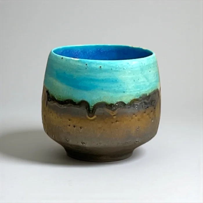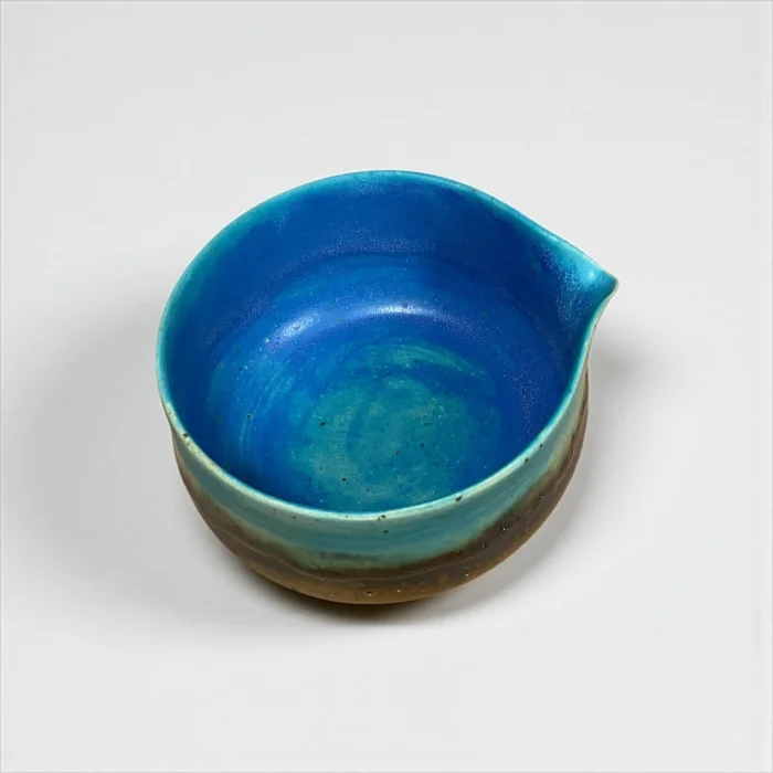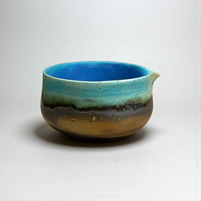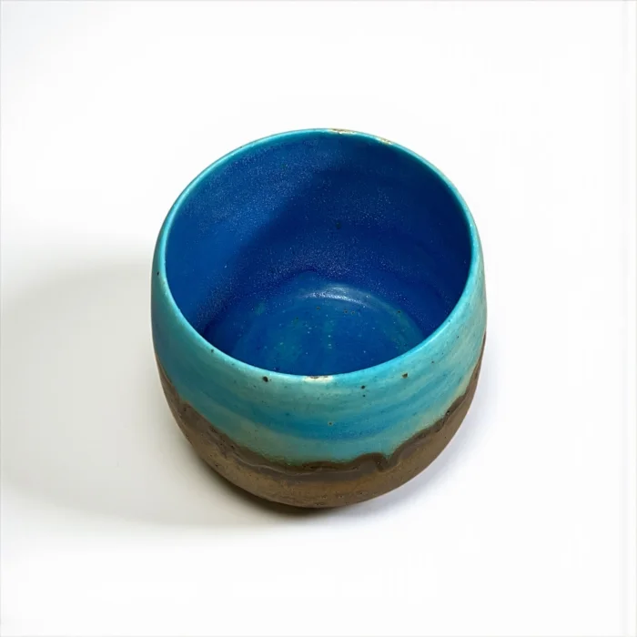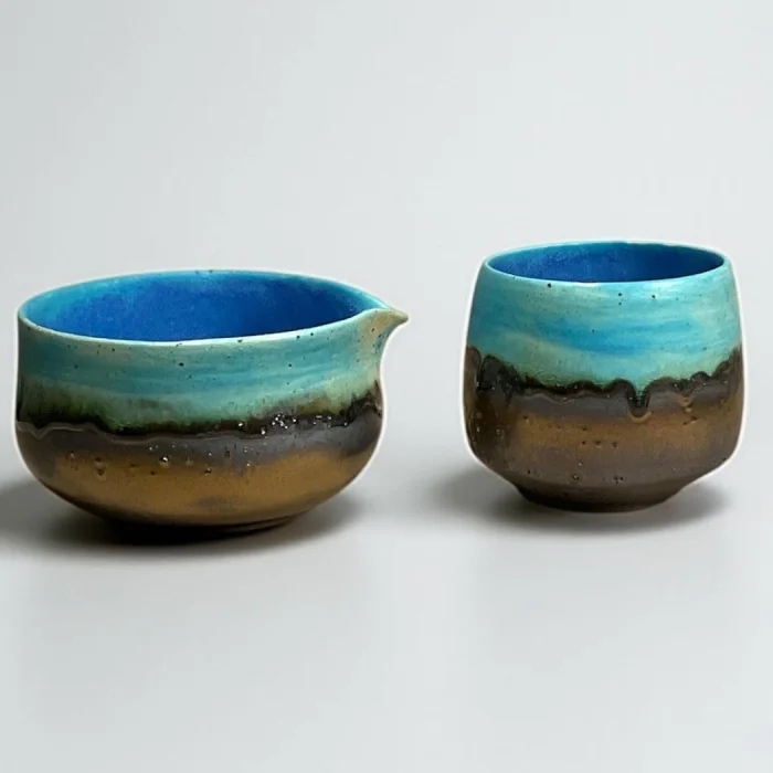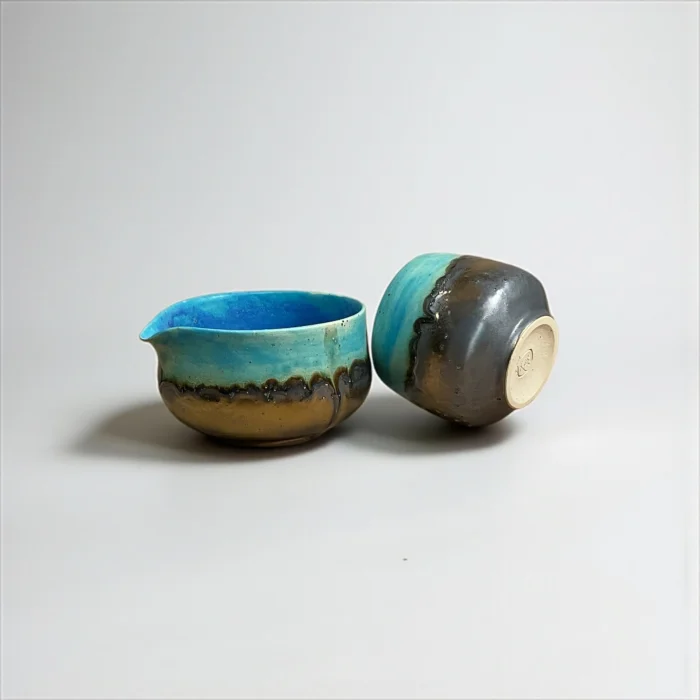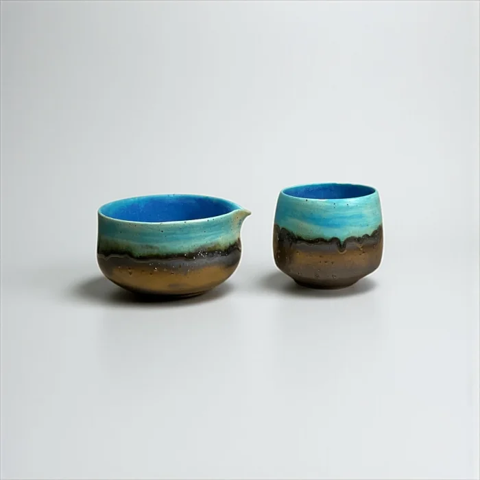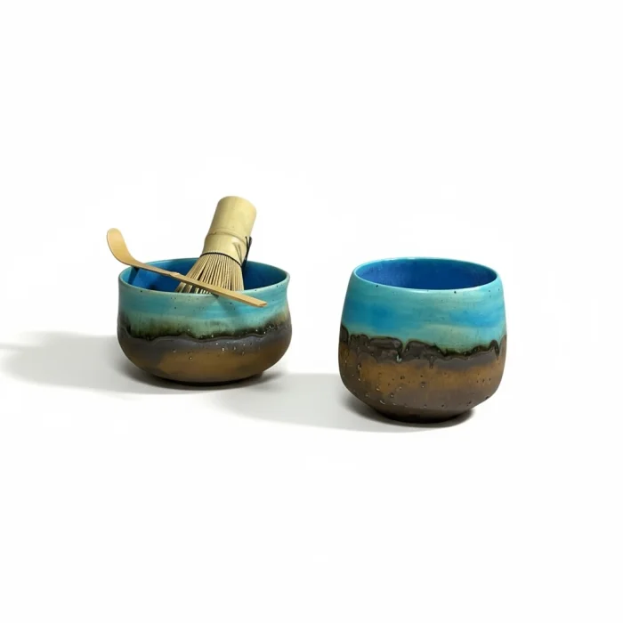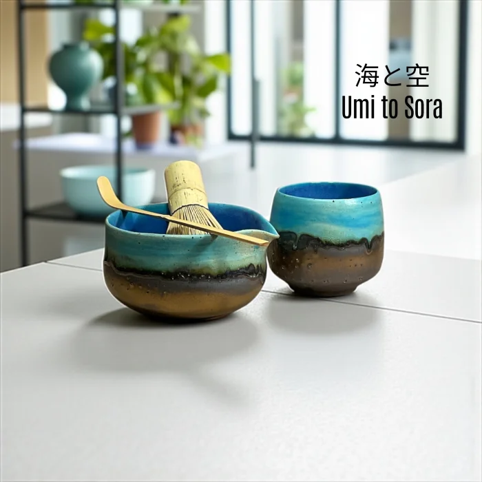 Inspired by the horizon where the sky and the sea meet, the Umi to Sora set attracts attention with its natural transitions where blue tones combine with brown. Umi to Sora in Japanese means "Sea and Sky". Each piece is hand-shaped, finished with special glazes. Only 1 set of this duo was produced. Set Contents: Matcha bowl (Chawan) Tea glass (Yunomi) Note: Bamboo whisk (Chasen) and bamboo spoon (Chashaku) are not included in the set. You can also add it to your cart if you want. Bowl : Mouth width 11 cm / Depth 6 cm / Height 7 cm / Volume 400 ml Glass : Mouth width 7.5 cm / Depth 7.5 cm / Height 8 cm / Volume 300 ml
