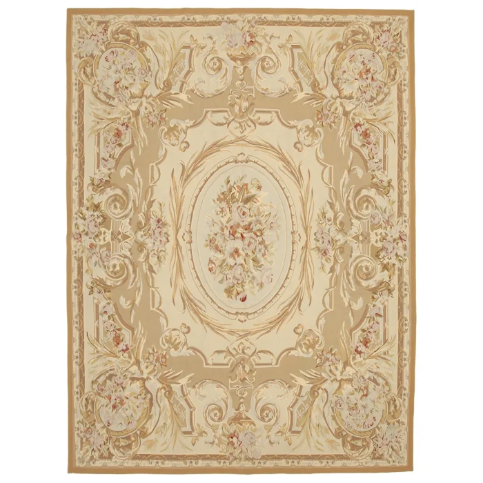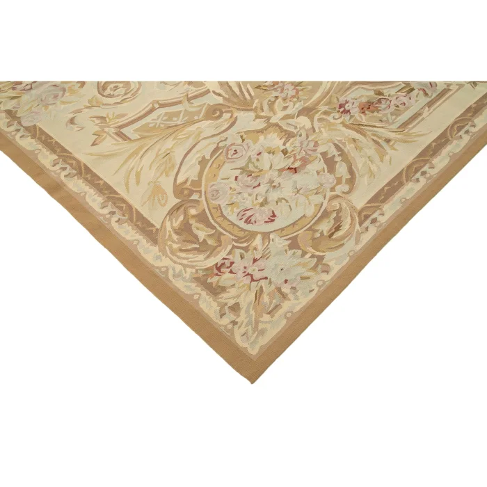 The Aubusson Rug is 270 cm wide by 367 cm long and about 5 mm thick. It weighs an average of 11 kg. It is made with hand-spun wool and cotton. It takes its colors from root dyes obtained naturally.
