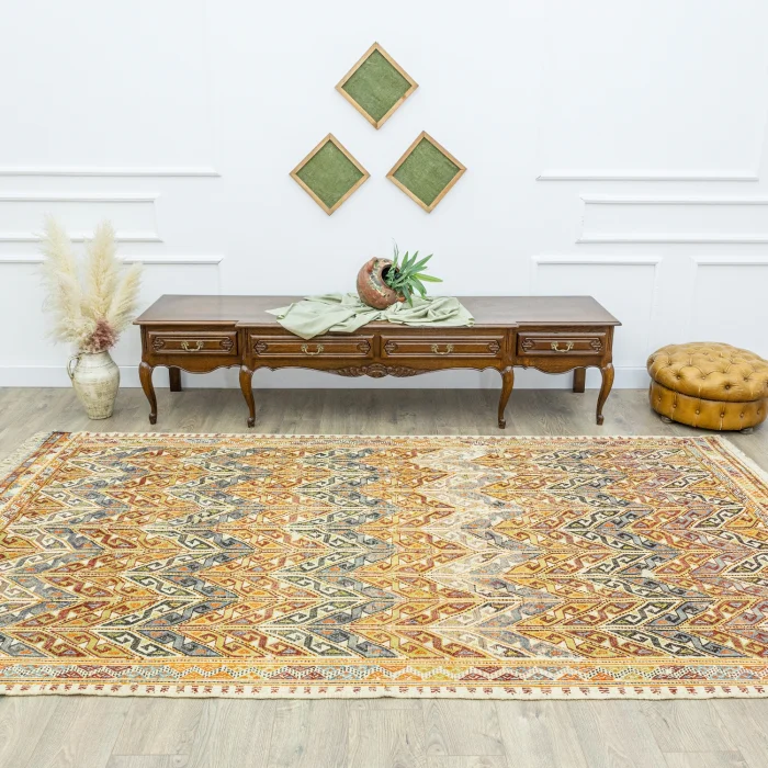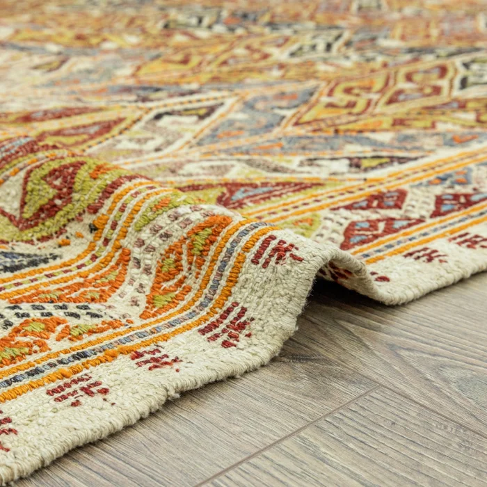 Traditional rug models that will add difference to your living space are here with Soho Antiq quality! This rug model, which is specially designed for all kinds of areas, is prepared with special hand weaving techniques and consists of completely natural cotton and wool. In the twine weaving technique, there are reliefs as if embroidered with a needle. . This is one of the many features that make it different. The main color of the rug model is sand beige, and the other side colors are orange, green and multicolored. Thanks to the colors that are compatible with each other, you will have an aesthetic rug. On the other hand, the size of the rug is 173 x 325 cm and the thickness is between 1 - 3 cm. You can have local touches with Soho Antiq. The design of the carpet is inspired by the Aegean Region and has the characteristics of the 1960s.
