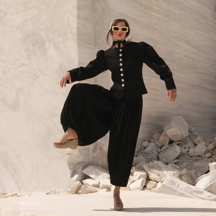 • Black Buttoned Front Padded Drawstring Jacket; It offers a nostalgic yet strong silhouette with its padded shoulders and gathered sleeves.