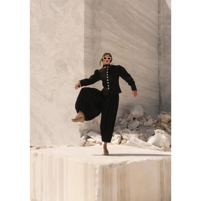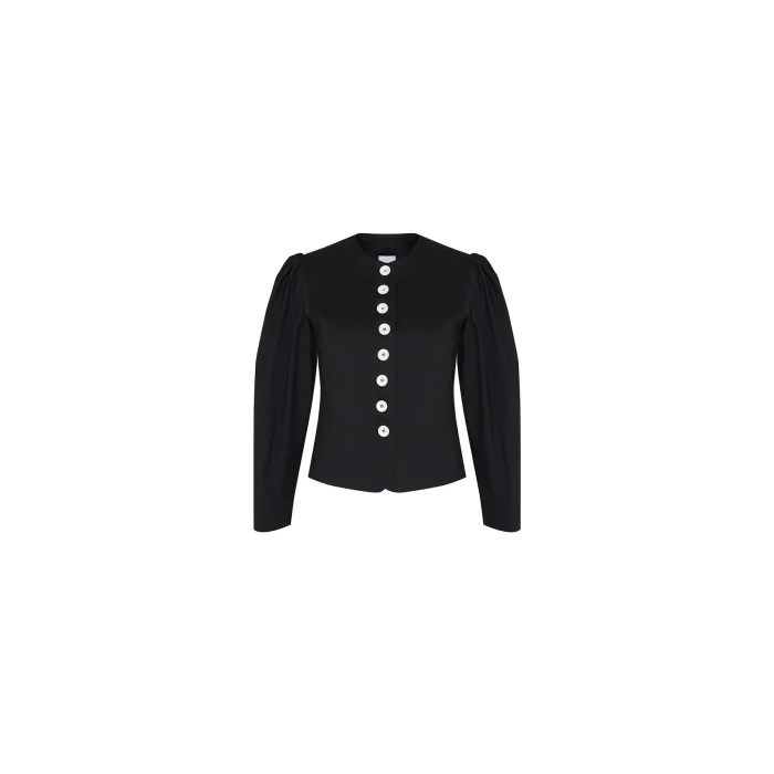 It is suitable for comfortable use throughout the day thanks to its cotton fabric.Black Buttoned Front Padded Drawstring Jacket; It offers a nostalgic yet strong silhouette with its padded shoulders and gathered sleeves.