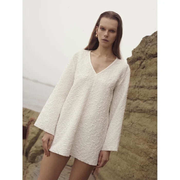 Straight cut with a V-neckline. Slightly flared sleeves for a relaxed silhouette.