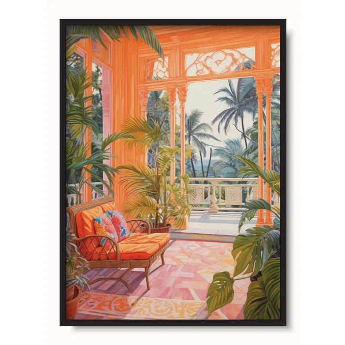 A view of a lush, tropical patio illuminated by a rich and warm light with vibrant vegetation.