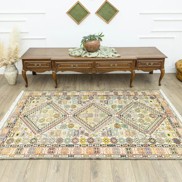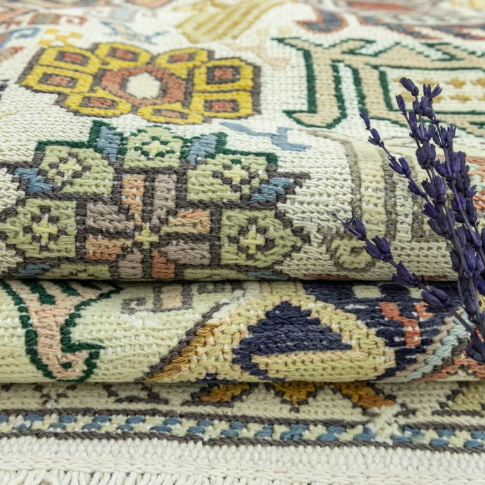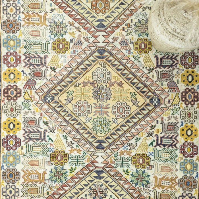 Hand-woven rugs that will add warmth and beauty to your home are now with you with Soho Antiq quality! These rugs, which are suitable for all kinds of decoration styles, are specially designed and produced with hand-weaving technique from completely natural silk and cotton yarns. This is one of the many features that make them different. The colors in the rug are cream, yellow and multicolored. Thanks to the colors that are compatible with each other, you will have an aesthetic rug