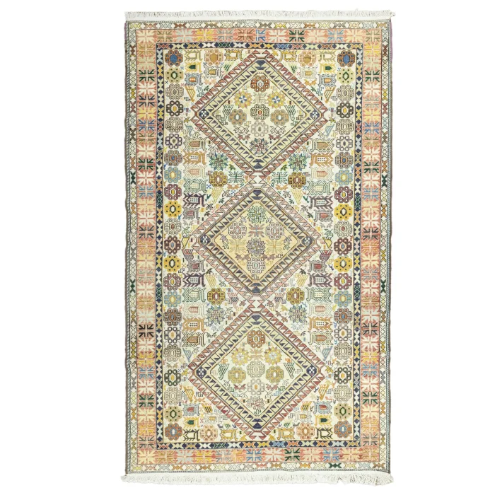 This rug is prepared with sumac weaving technique. Sumac rugs, unlike plain woven rugs, are made by wrapping additional threads on top of warp threads. This technique gives the rug a more durable structure and makes the texture look fluffy and plump. The size of the hand-woven rug is 124 x 217 cm and the thickness is between 1-3 cm. Our rugs, which have local touches, are inspired by the original designs of Iran. Sumac rugs have rich and detailed patterns. It often includes geometric shapes, floral motifs, and stylized animal figures. These designs have a special 2000s style and will add a nostalgic atmosphere to your home.