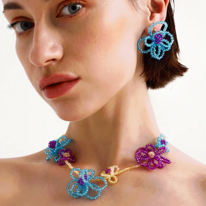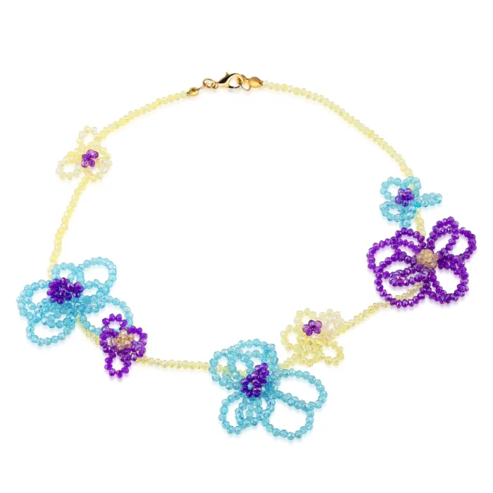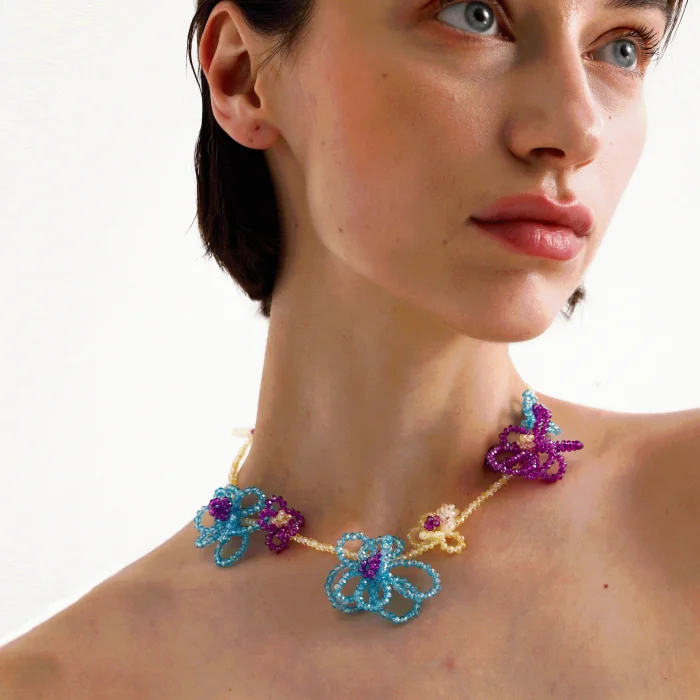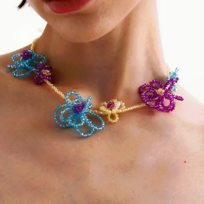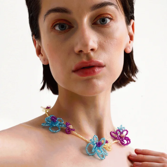 It is produced by knitting millimetric crystal beads with fishing line with a resistance capacity of 8+kg.