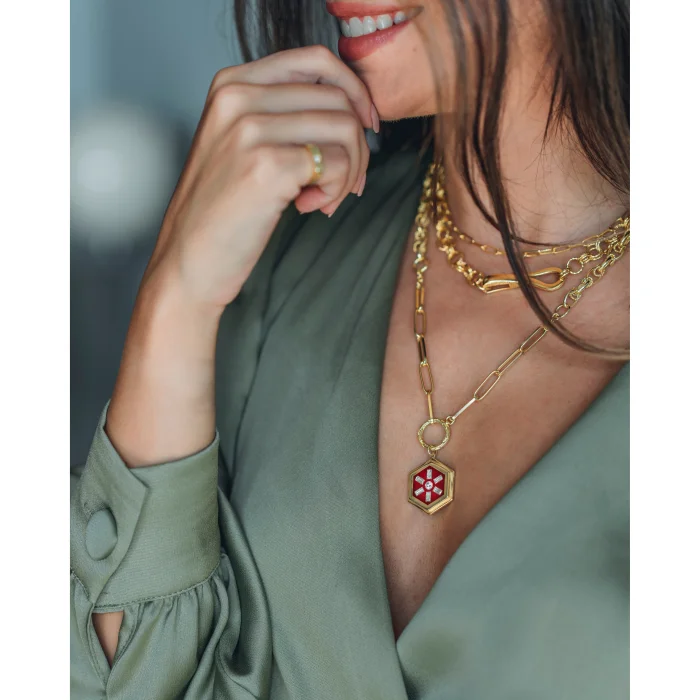 Enamel Baguette Medallion Necklace Features: 925 Sterling Silver 22K Gold Plated Necklace Color: Gold It is colored with warm enamel technique. Enamel colour: Burgundy or Green The baguette is detailed with stone. Approximate Weight: 31,43 gr Approximate necklace length: 60 cm