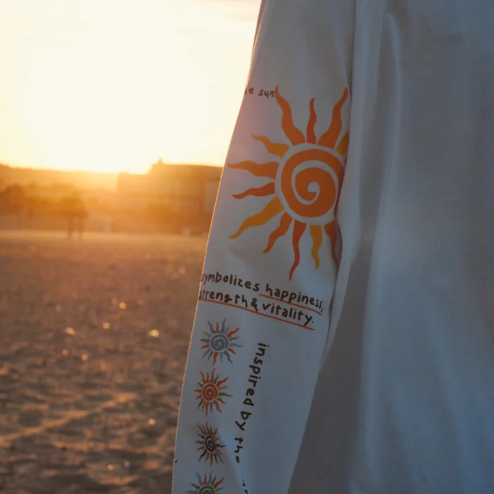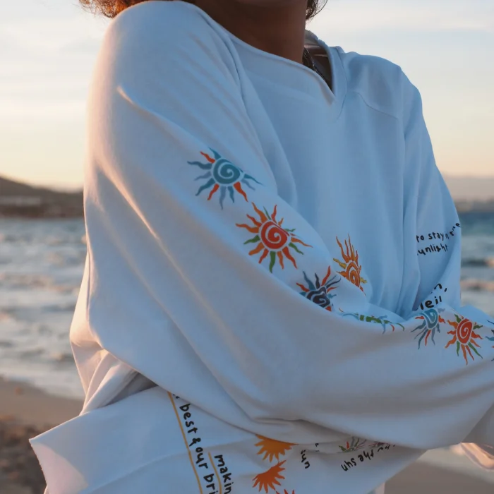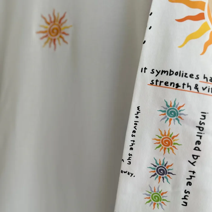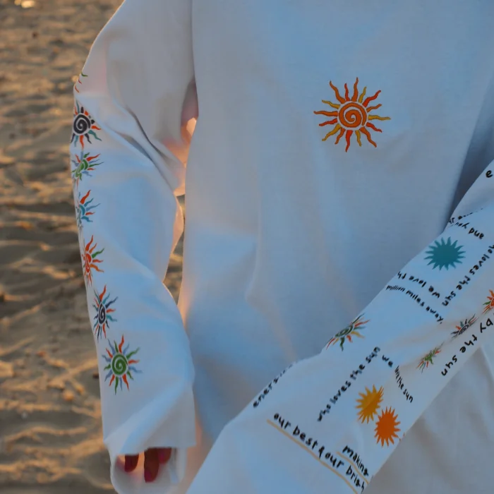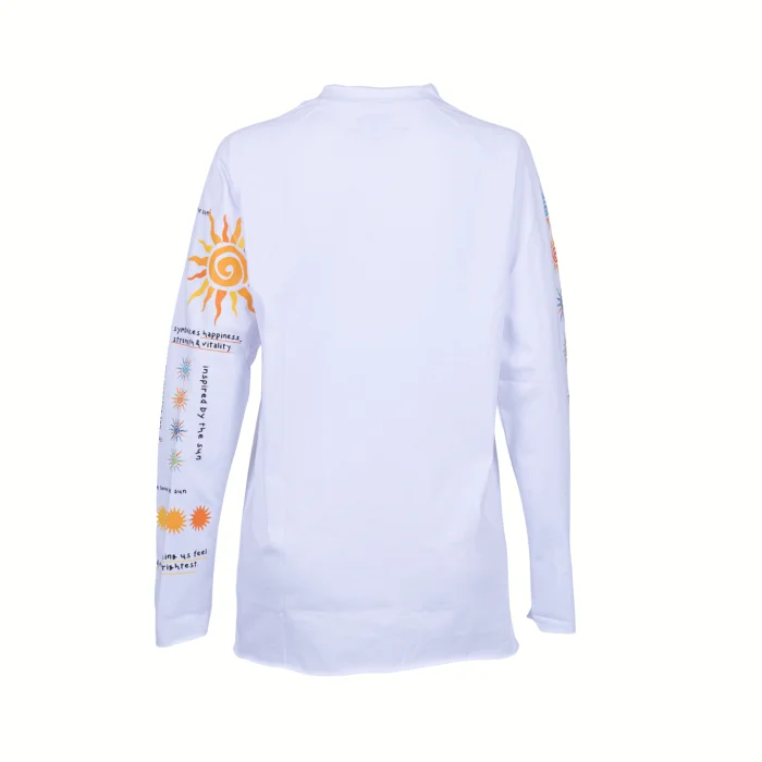 Made from 100% cotton for a natural and soft touch. Features an embroidered sun motif on the front and different full-print patterns on each sleeve. Designed with a raw edge neckline, this piece features an unfinished cut for a slightly relaxed, vintage-inspired look. Instead of the traditional ribbed or clean finish, the collar offers a more casual and unique style. Instead of irritating tags, the logo and care instructions are printed on the neckline. Shipped in eco-friendly, recyclable packaging.
