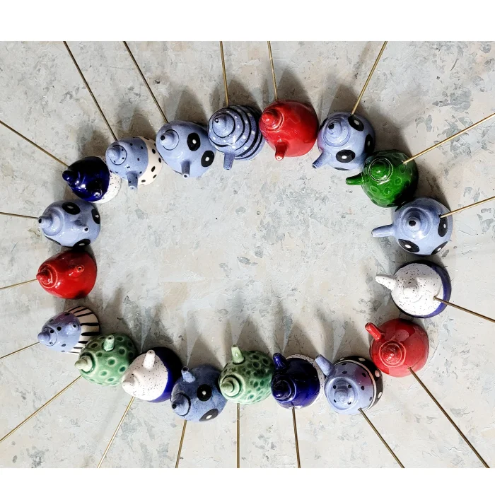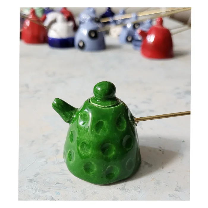 Ceramic, miniature teapot shaped, brass handle candle extinguisher.