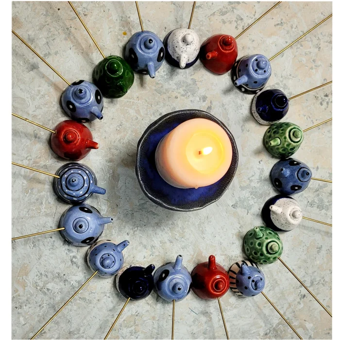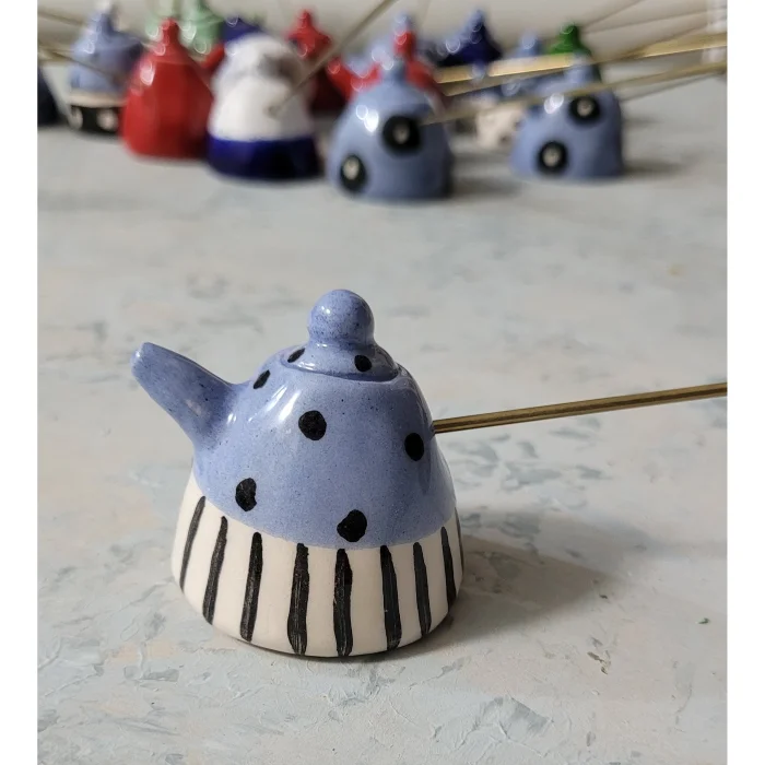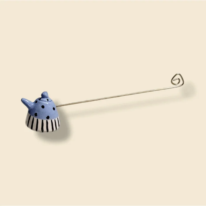 Ceramic, miniature teapot shaped, brass handle candle extinguisher.