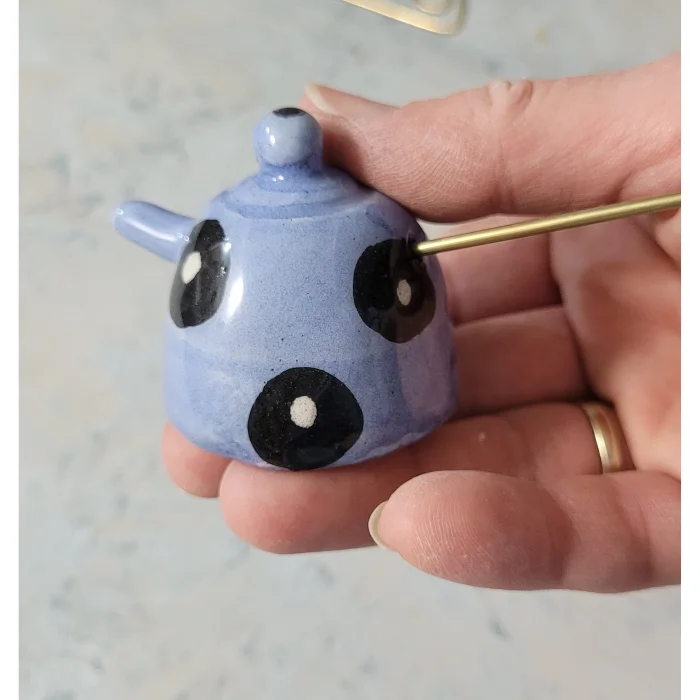 Ceramic, miniature teapot shaped, brass handle candle extinguisher.