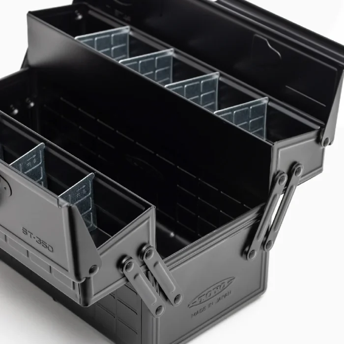 Everyone needs a mechanic's tool chest. Based on Keiyu Hisashi's design dating back to 1947, this rugged, classic ST-350 tool roof is ideal for home use. It is made of sturdy stamped steel and opens in a single smooth movement, pulling the levers. It has removable dividers for things like screws, nails, pliers, etc. The large area at the bottom provides space for larger tools such as hammers, pegs, or anything else with a long handle, and thanks to its timeless enamel coating, you don't have to hide your toolbox, it blends in like a decorative object.