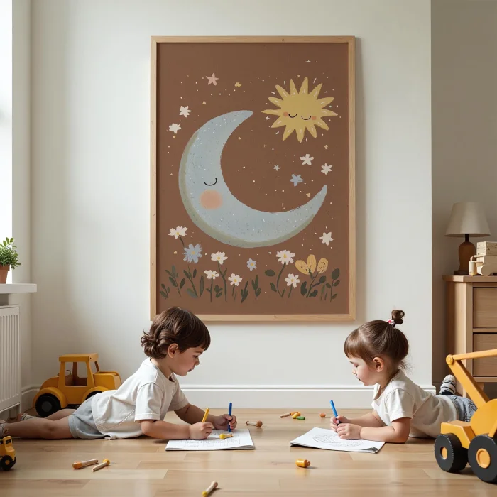 Product: Sleeping Moon And Sun Friendship Illustration Kids Room Wooden Wall Art