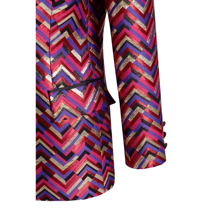Single-button blazer made from metallic brocade woven fabric, featuring satin fabric detailing on the collar and piped edges on the pocket welts. It can be paired with two different skirt models from the same collection.