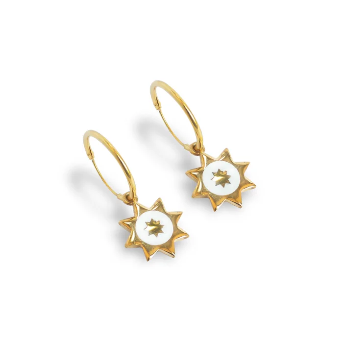Hoops are 18 carat gold plated on 925 sterling silver. Their bodies are 18 carat gold plated on bronze.